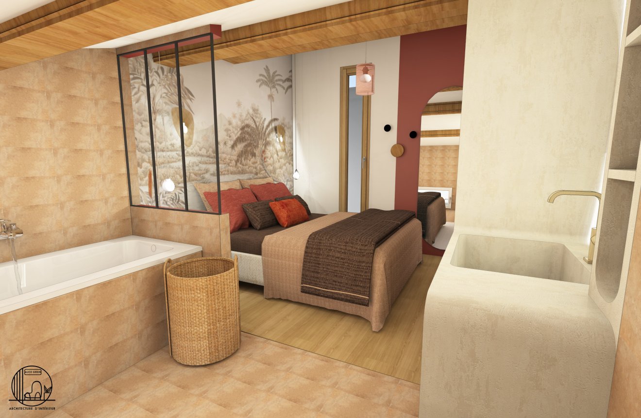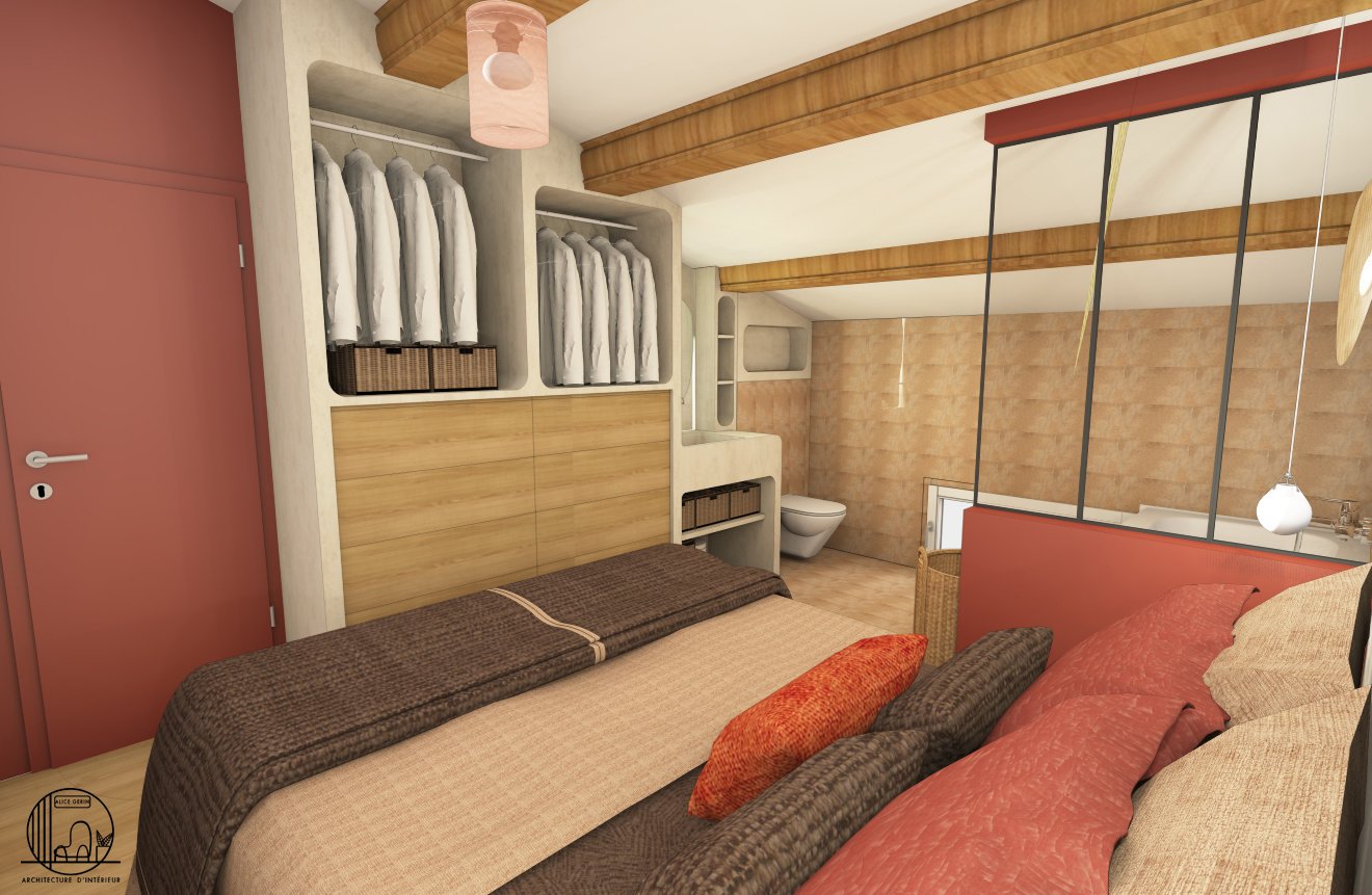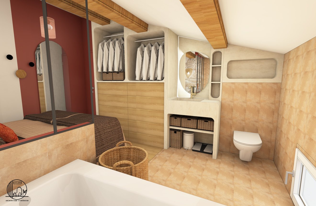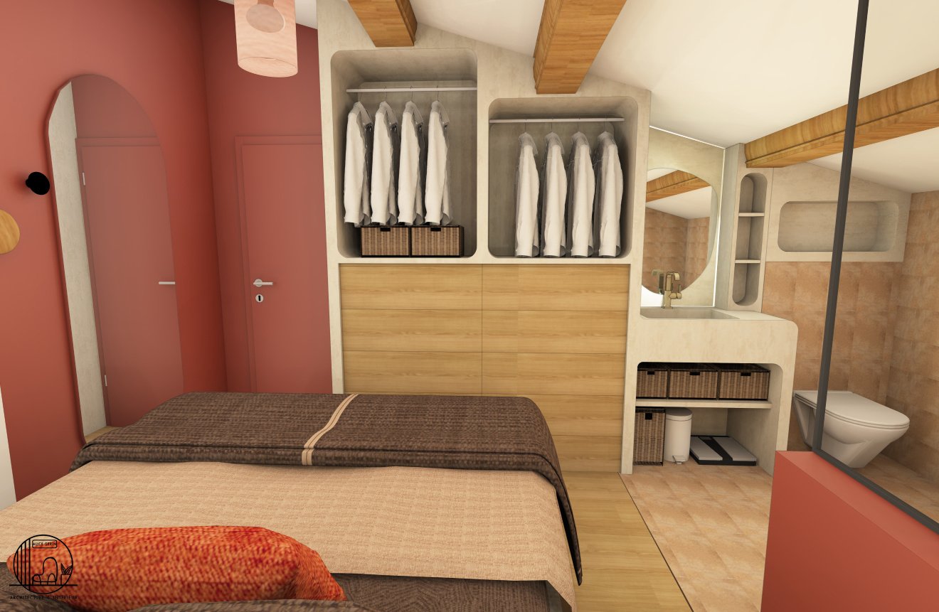 Simulation 3D d’une rénovation d’une suite parentale à Arles. L’étage de cette maison d’une surface de 25 m2 a totalement été repensé par Alice Architecture Intérieur comme un intérieur typique de la région Provence Alpes Côte d’Azur avec la présence de béton pour le dressing et la vasque de la salle de bain. Le but de ce projet d’architecture intérieur était de redonner de la fraîcheur à la chambre tout en conservant le travertin.
