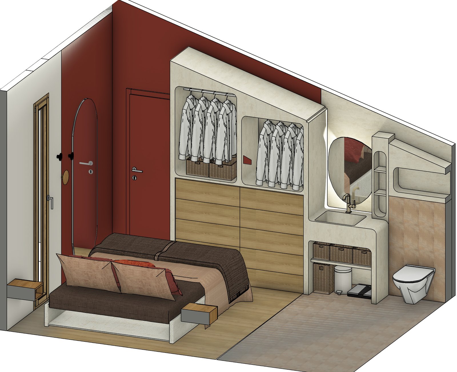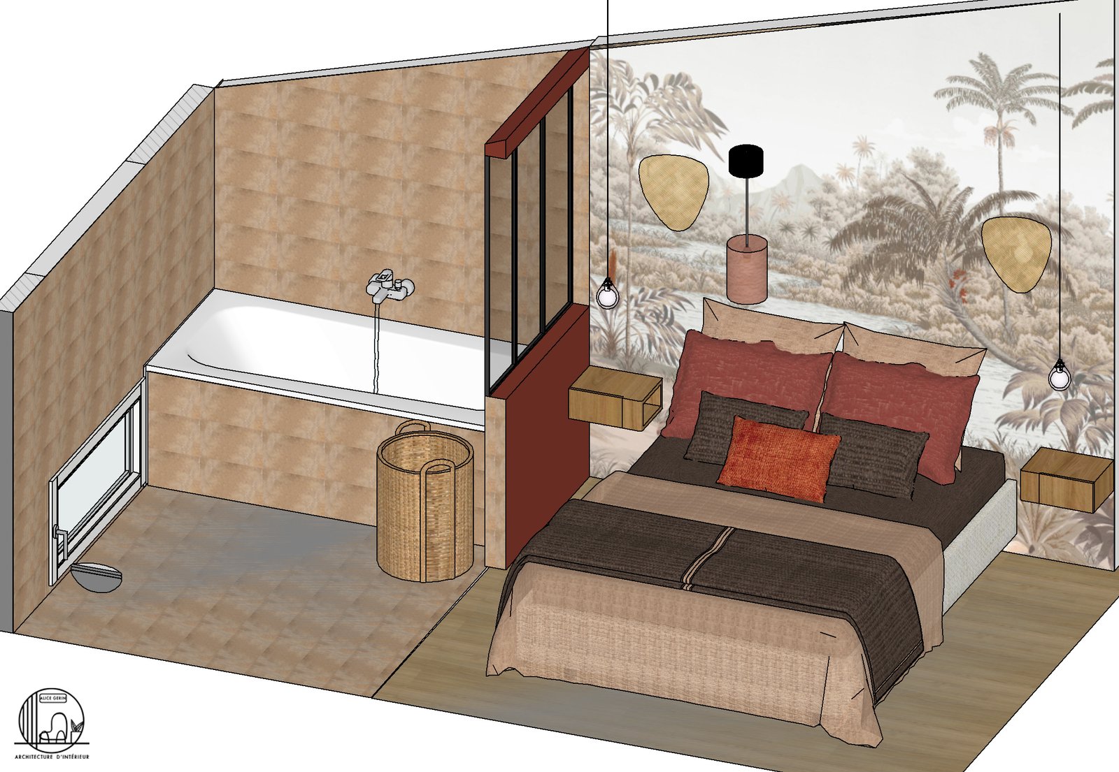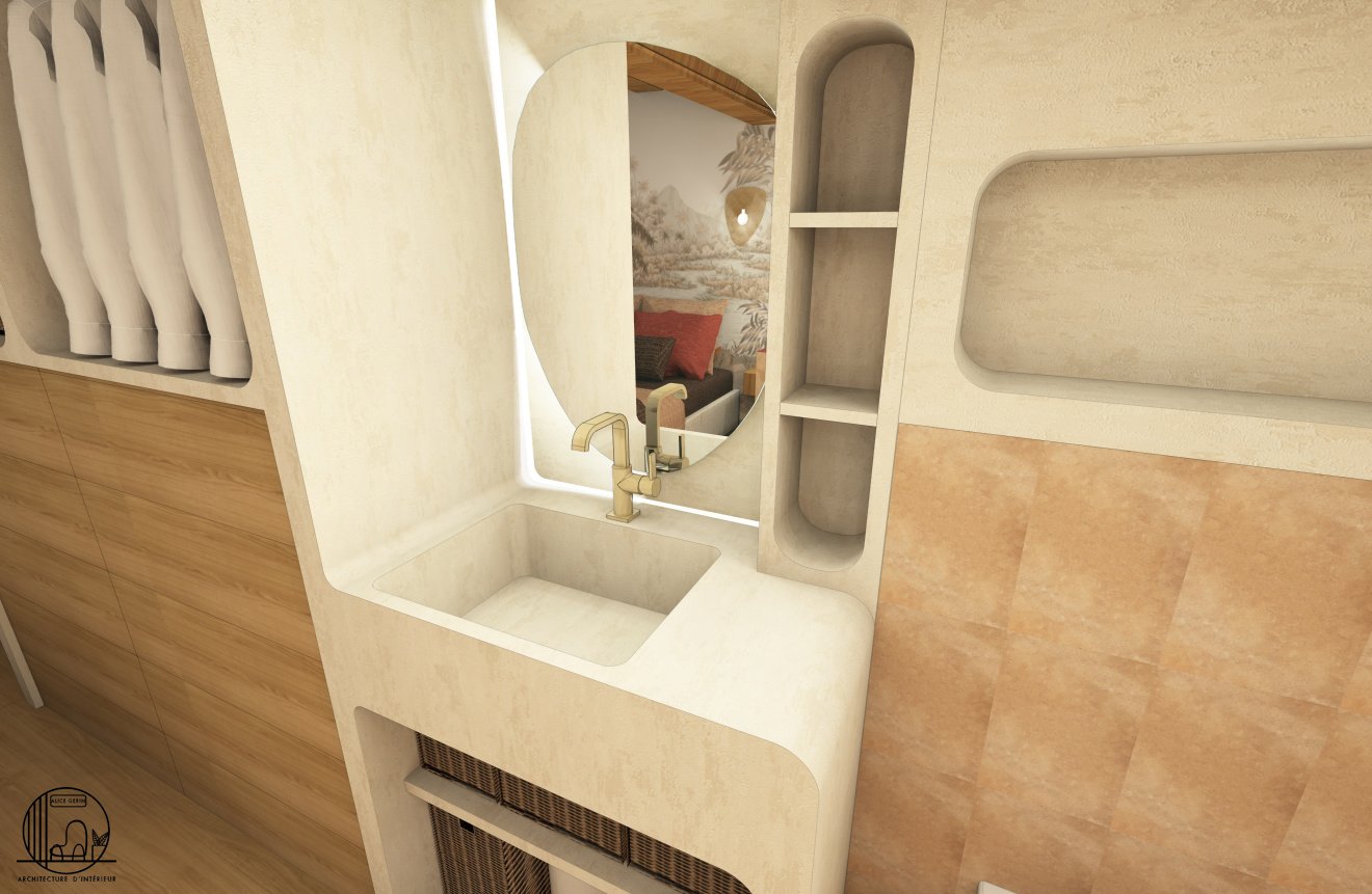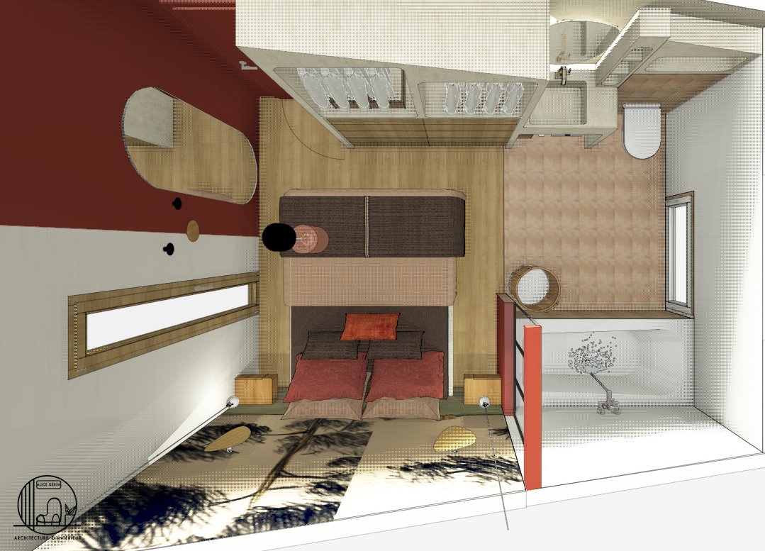 Simulation 3D d’une rénovation d’une suite parentale à Arles. L’étage de cette maison d’une surface de 25 m2 a totalement été repensé par Alice Architecture Intérieur comme un intérieur typique de la région Provence Alpes Côte d’Azur avec la présence de béton pour le dressing et la vasque de la salle de bain. Le but de ce projet d’architecture intérieur était de redonner de la fraîcheur à la chambre tout en conservant le travertin.